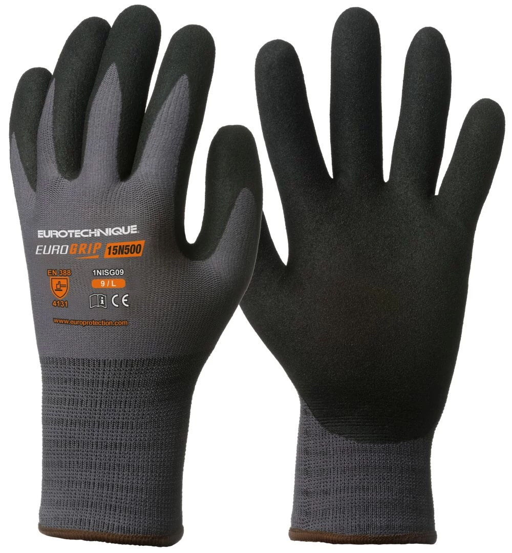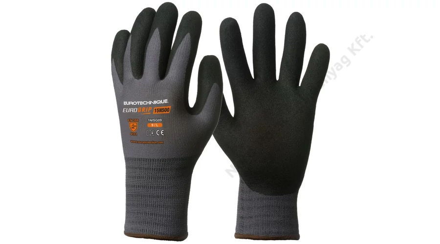 Ismerje meg a Eurogrip tenyerén fekete nitril+sandy csúszásbiztos réteg_9 000626 részletes leírását! Ez a minőségi Eurogrip szerelőkesztyű fekete nitril anyagból készült, tenyerén csúszásbiztos sandy réteggel, amely biztos tapadást és védelmet nyújt.
