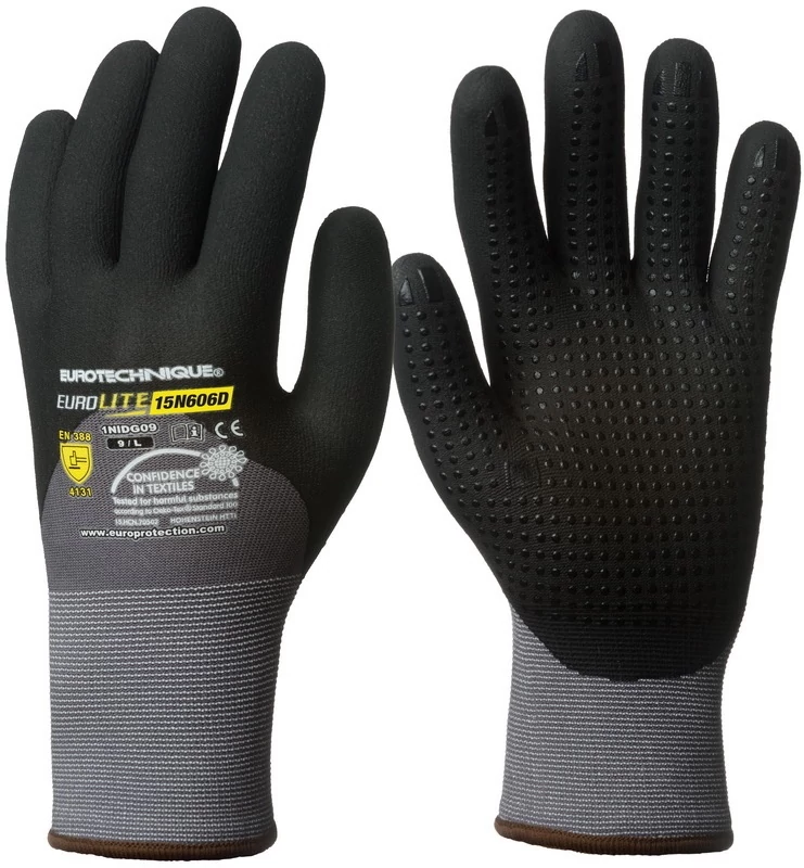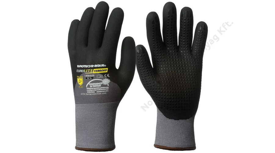 Ismerje meg a Eurolite ökölcsontig fekete mikrohabosított nitril+petty_9 000630 részletes leírását! Ez az Eurolite fekete nitril kesztyű mikrohabosított tenyérrel és pöttyös mintázattal készült, amely biztosítja a kiváló tapadást és a kéz védelmét.