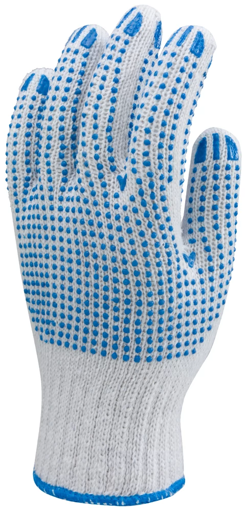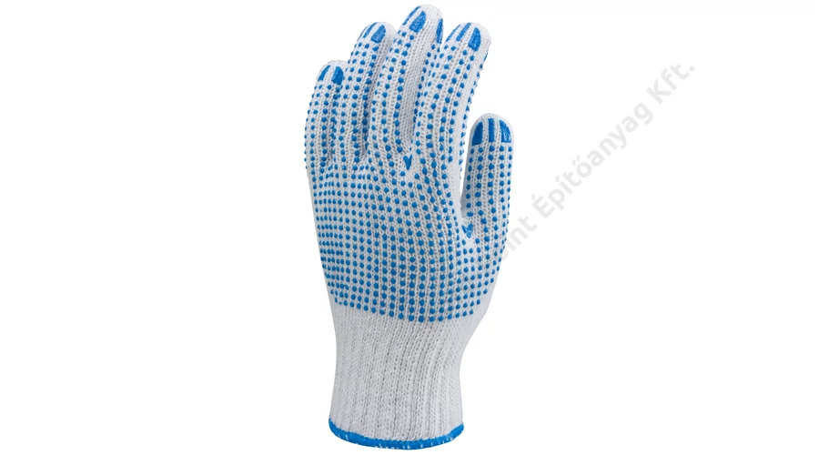 Ismerje meg a Kötött PES/pamut fehér kesztyű, két oldalon kék pöttyök_9 001044 részletes leírását! Ez a fehér kötött kesztyű PES és pamut anyagból készült, mely biztosítja a tartósságot és a kényelmet hosszabb munkavégzés során is.