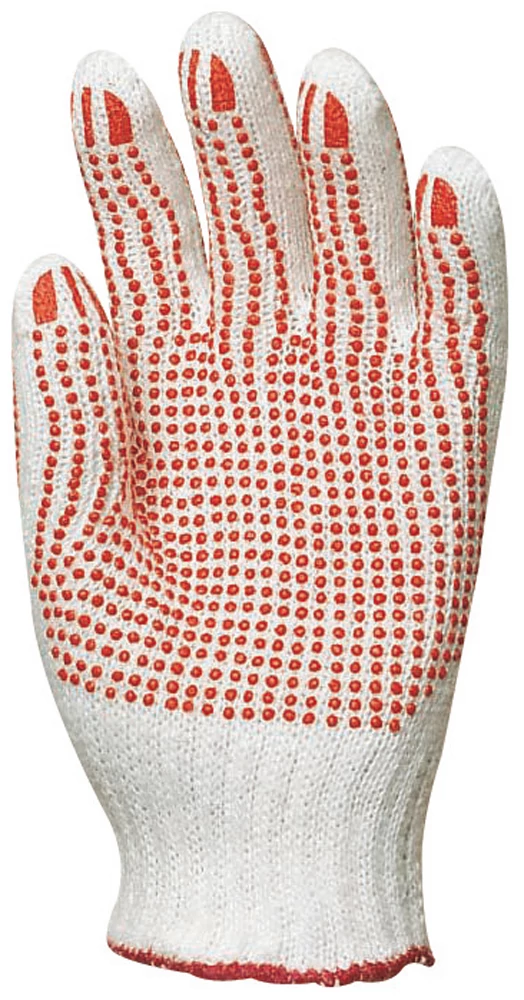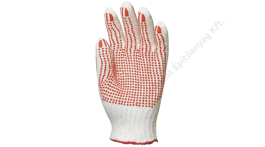Ismerje meg a Kötött PES/pamut fehér kesztyű, két oldalon piros pettyek_8  001045 részletes leírását! Ez a fehér kötött kesztyű PES és pamut anyagból készült, biztosítva a tartósságot és kényelmet hosszabb munkavégzés során.